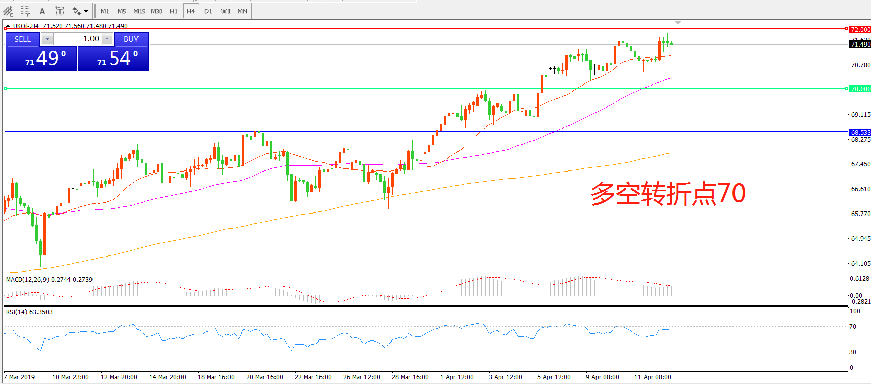 4小时图看,油价连续上行后,触碰上方72阻力后有所回落,显示上方阻力依然较强,均线系统依然呈多头排列,MACD红柱减少,RSI指标走平,短期有回落可能,但整体走势依然偏多。