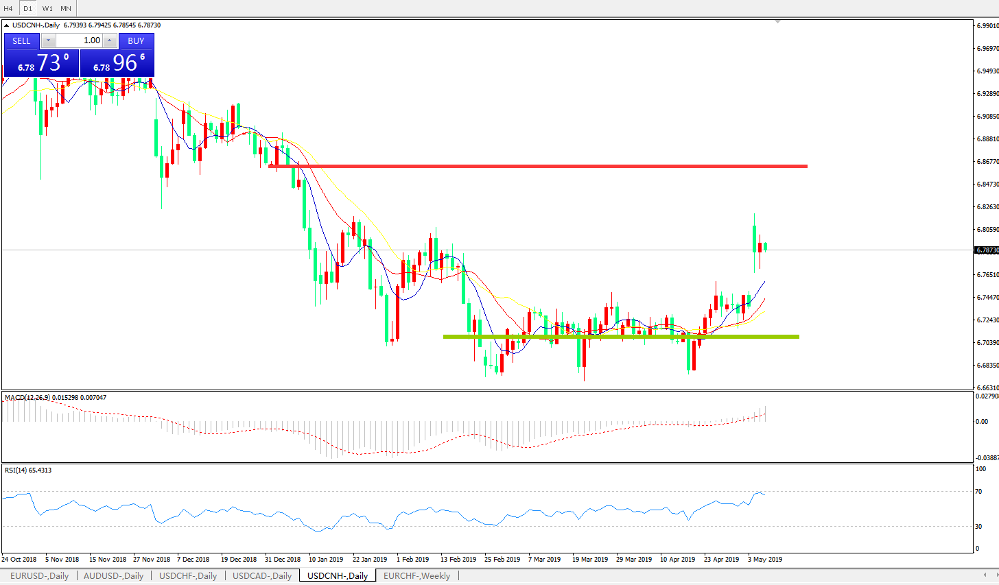 技术面简析:日线均线呈有序多头排列看多汇价拉升后开启窄幅整理态势,MACD上穿0轴且动能柱0轴上方快速放量RSI急速走升,汇价击穿上方压制继续上行,预计短期汇价或存在整理可能,中期不排除有进一步上行空间,重点关注中美贸易谈判最新进展及特朗普推特更新情况