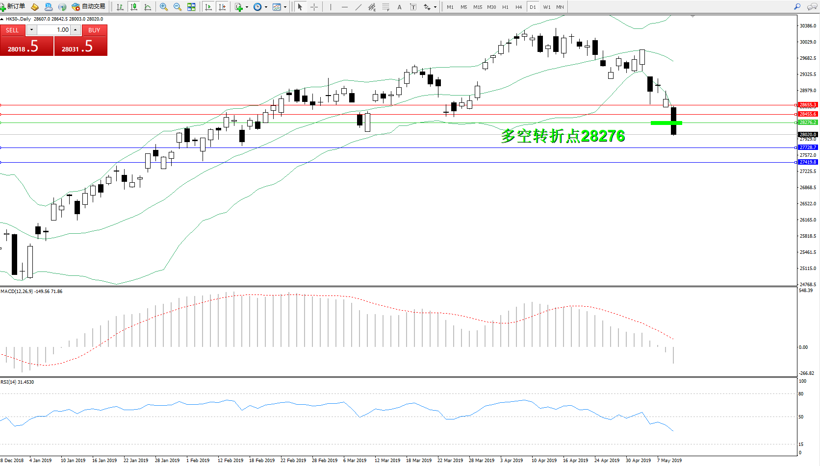 香港恒生指数收盘跌2.4%,报28311.07点,跌近700点,创两个月来新低。吉利汽车跌近6%领跌蓝筹,药明康德跌近8%,中金公司跌5.2%。内地沪深股市早上低开,后公布数据稍见理想。上证跌幅收窄。深证及创业板更曾经反弹倒升。唯弱势持续,再度回落,并扩大跌幅至收市。4月份全国居民消费价格指数 CPI 按年上升2.5%,符预期及好过3月升2.3%。同时创出自2018年10月以来的高位。港股早上跟随外围弱势。 VIX 月内急剧上升,高见21.84,创出近月高位。指数反映投资者极度担心,对后市表现并不乐观。
