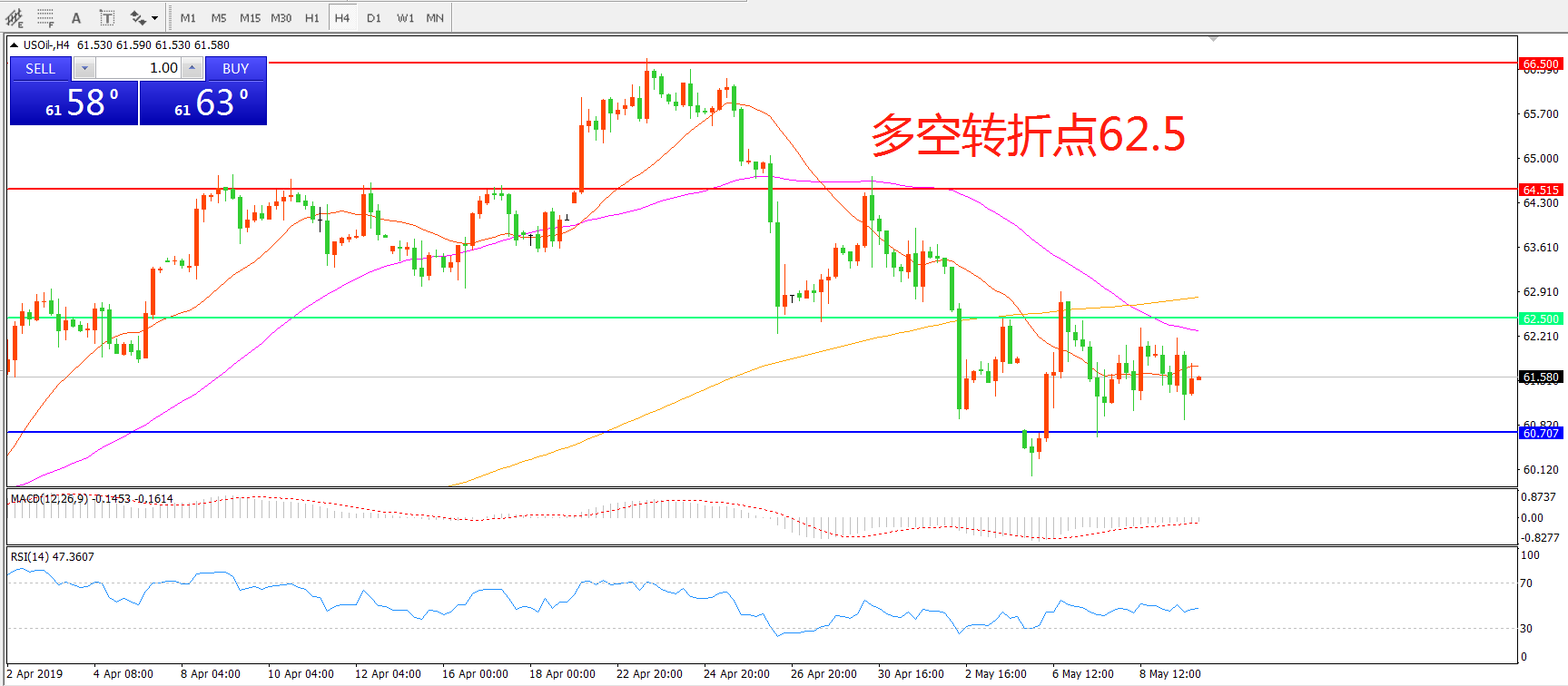 周四,商务部新闻发言人高峰今日表示,刘鹤副总理率团赴美参加新一轮高级别磋商,展现了中方负责任的态度和推动磋商的诚意,希望美方与中方相向而行,照顾彼此关切,通过合作和协商的办法,解决存在的问题。同时,中方已经做好应对各种可能的准备。隔夜,美国美国贸易代表办公室在联邦公报草案中证实,当地时间周五(5月10日)零时零一分起2000亿美元自中国进口商品的关税税率将从10%上调至25% ,中美贸易磋商依然牵动着市场神经,这令原油等风险资产整体承压,WTI原油昨日小幅下跌,收报 61.67美元/桶。