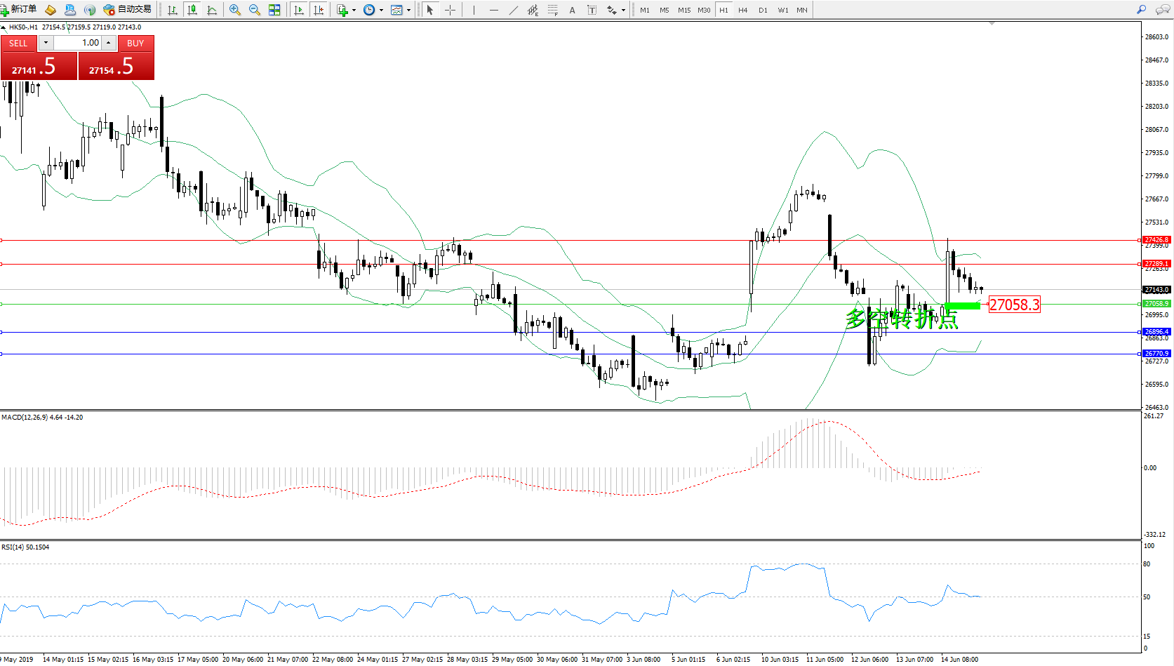 香港恒生指数6月17日(周一)收盘上涨108.81点,涨幅0.40%,报27227.16点;港股的走势要比A股强,直接是高开,而且早段还有冲高的动作,不过尾市还是没有挺住,这恐怕和A股严重缩量之后市场信心不足有关。沪伦通17日正式启动,中国资本市场双向开放再次迎来大动作。以27300点作为多空的分水岭,今天的尾盘并没有站上这个点位,而且,今天还留下了跳空缺口没有回补,正常情况下,今天这个跳空缺口是要完全回补的,回补之后看恒指在27100点的支撑情况,还是要看消息面的变化。