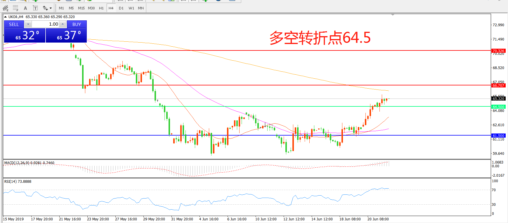 “超级央行周”在上周再次证实了其威力,在美国总统特朗普的口诛笔伐下,美联储终于奏响潜在降息的序曲,加入其他央行的宽松大潮之中,此外,本周中美贸易局势传出新消息,两国首脑同意在日本G-20峰会上会晤,市场对此屏息以待。美伊紧张局势不断加剧,特朗普对伊朗进行军事打击仅“一步之遥”。 布伦特原油周五收报65.32美元/桶。