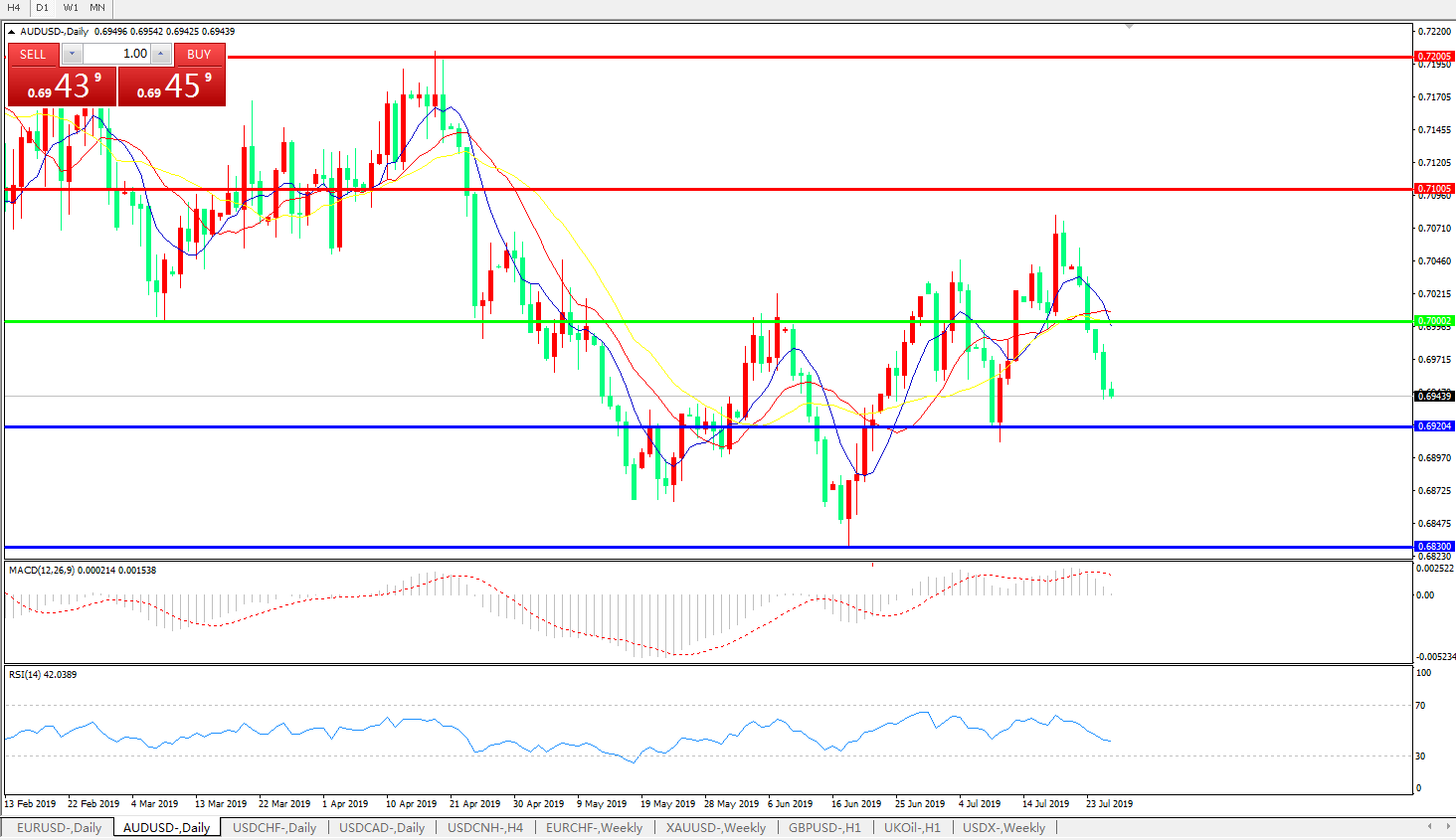 澳元兑美元在周四日内延续疲软走势,自上周五以来已经连续第五个交易日走低。近期美元指数的坚挺表现显然对非美货币起到了打压效果,而澳洲联储官员日内的表态则更是起到了推波助澜的效果;澳洲联储主席洛威稍早表示,在澳洲联储此前在6月和7月“背靠背”降息之后,未来仍有进一步加大宽松力度的需求和空间,此状况令投资者反而对澳洲经济前景以及其在全球贸易风波中的处境感到益发担心,因而,澳元继续回吐前期涨幅,回撤到0.6960一线的两周低位; 技术上来看,澳元兑美元暂时在60日均线切入位0.6961尚有支撑,若失守,将进一步下看7月初的前期波段低点0.6911 ,该点位的失守将意味着下行趋势被重新巩固。而反过来,如果汇价能在短期内收复0.70关口,则前景将被重新看好。