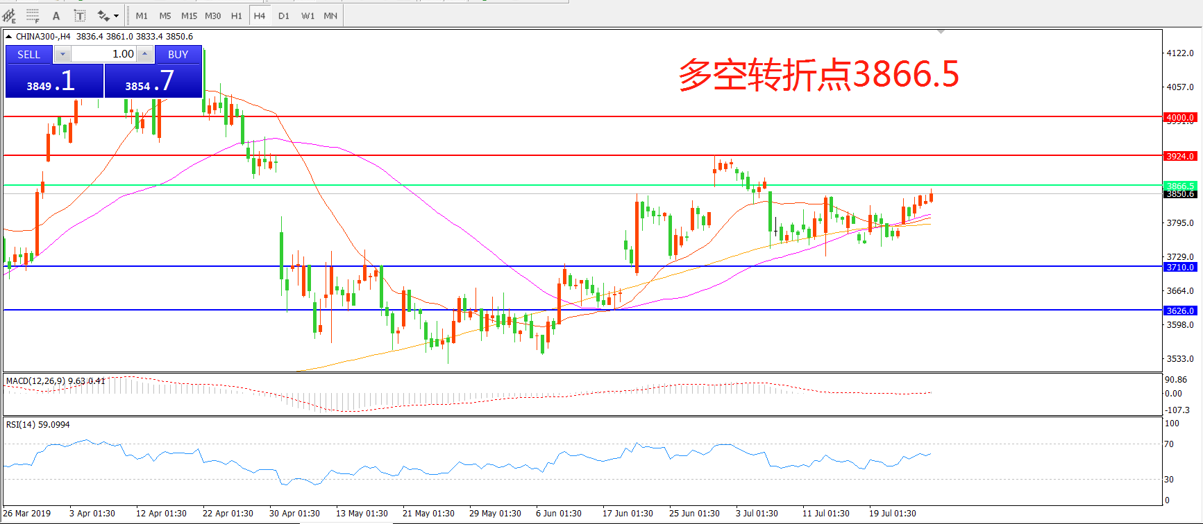 4小时图看,沪深300指数延续反弹格局,均线系统粘合形成支撑,RSI指标向上,日内若能突破3866.5一线阻力,整体将进一步上行。