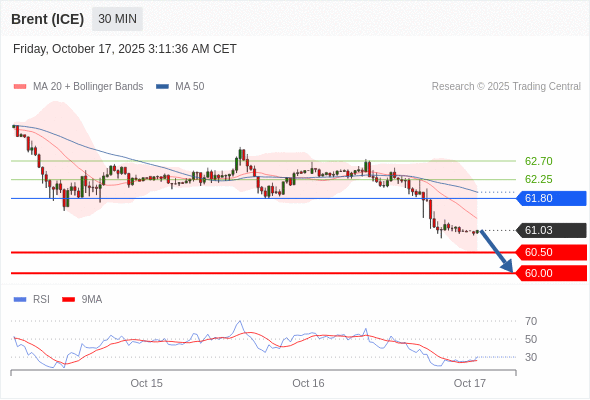 在 61.80 之下,看跌,目标价位为 60.50 ,然后为 60.00 。