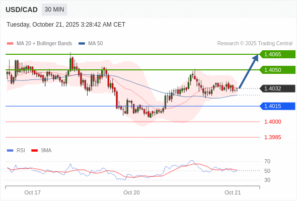 在 1.4015 之上,看涨,目标价位为 1.4050 ,然后为 1.4065 。