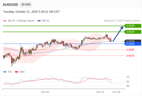 在 0.6500 之上,看涨,目标价位为 0.6530 ,然后为 0.6545 。
