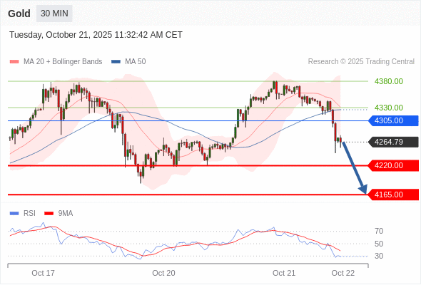 在 4305.00 之下,看跌,目标价位为 4220.00 ,然后为 4165.00 。