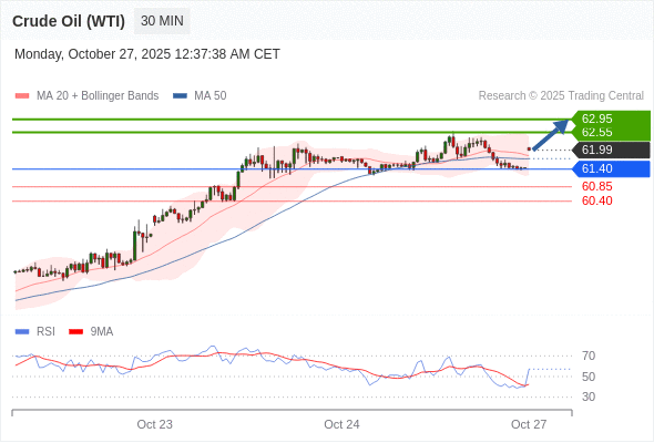 在 61.40 之上,看涨,目标价位为 62.55 ,然后为 62.95 。
