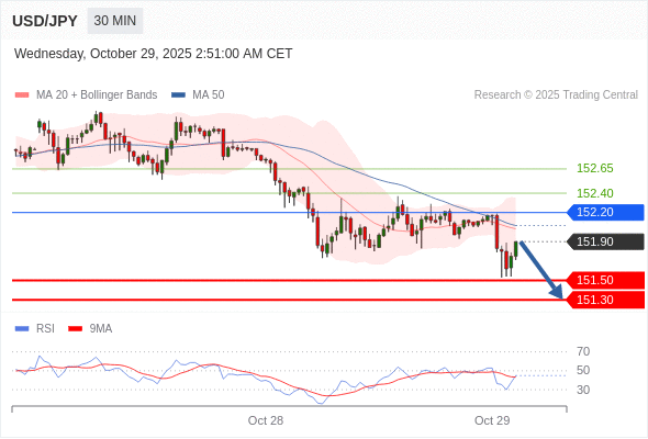 在 152.20 之下,看跌,目标价位为 151.50 ,然后为 151.30 。