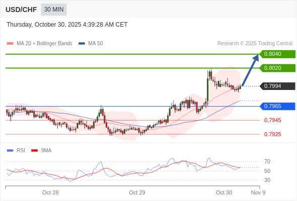 美元/瑞郎 当日内: 在0.7965之上,看涨。
