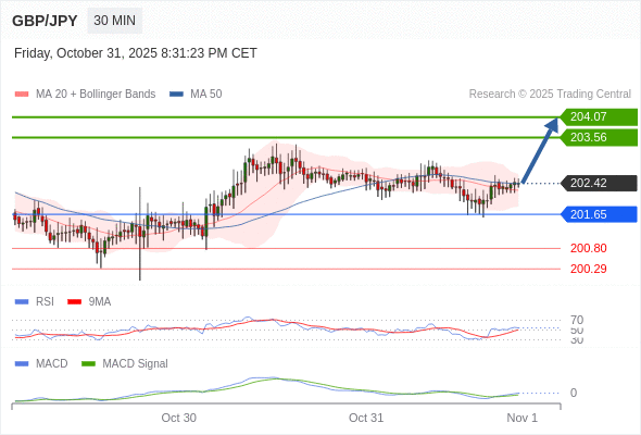 英镑/日元 当日内: 看涨,当 201.65 未被跌破。