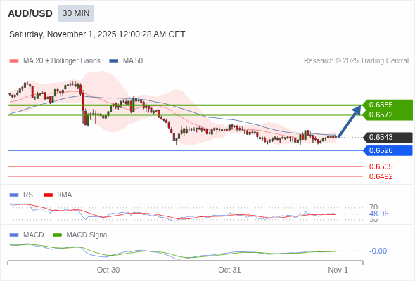 澳元/美元 当日内 : 有上涨的可能,目标价位定在 0.6585 。