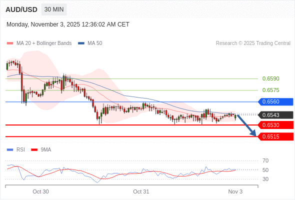 在 0.6560 之下,看跌,目标价位为 0.6530 ,然后为 0.6515 。