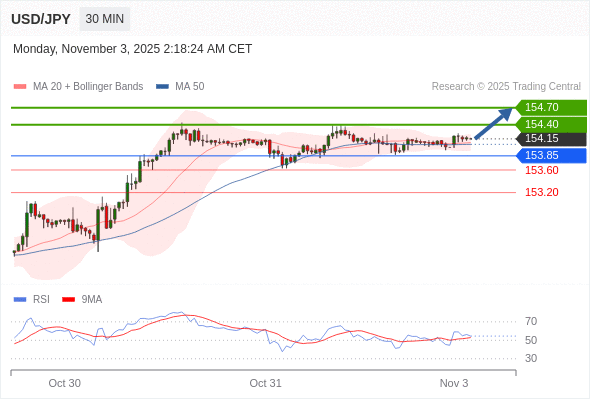 在 153.85 之上,看涨,目标价位为 154.40 ,然后为 154.70 。