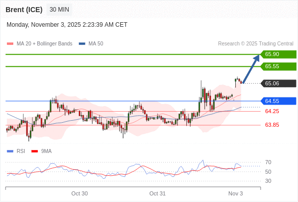 在 64.55 之上,看涨,目标价位为 65.55 ,然后为 65.90 。