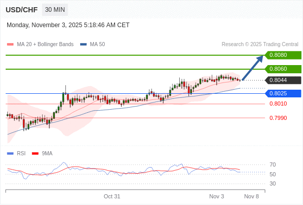 在 0.8025 之上,看涨,目标价位为 0.8060 ,然后为 0.8080 。