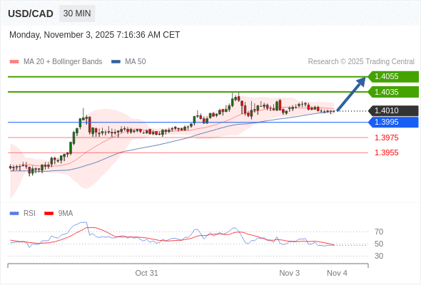 在 1.3995 之上,看涨,目标价位为 1.4035 ,然后为 1.4055 。