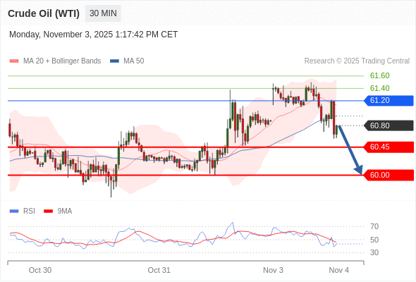 交易策略: 在 61.20 之下,看跌,目标价位为 60.45 ,然后为 60.00 。