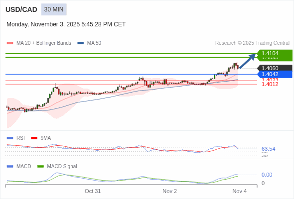 美元/加元 当日内 : 看涨,当 1.4042 为支撑位。