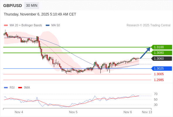 在 1.3025 之上,看涨,目标价位为 1.3080 ,然后为 1.3100 。