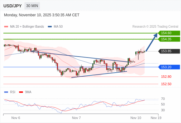 在 153.20 之上,看涨,目标价位为 154.35 ,然后为 154.60 。