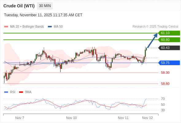 在 59.75 之上,看涨,目标价位为 60.80 ,然后为 61.10 。