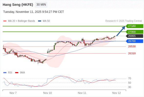 香港恒生指数期货 当日内: 目标位为27000。