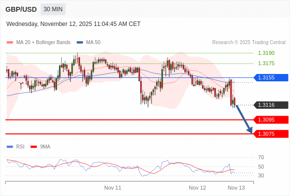 在 1.3180 之下,看跌,目标价位为 1.3095 ,然后为 1.3075 。