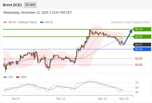 在 64.35 之上,看涨,目标价位为 64.95 ,然后为 65.30 。