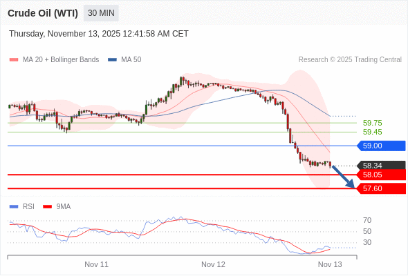 在 59.00 之下,看跌,目标价位为 58.05 ,然后为 57.60 。