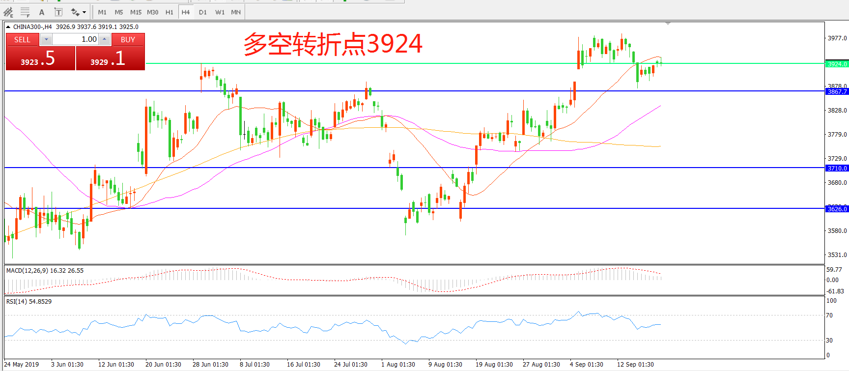 4小时图看,沪深300延续高位震荡,整体走势有所回暖,3924成为短期多空分水岭,MACD红柱减少,RSI指标走平,日内依然有回落风险,但中期走势依然偏多。