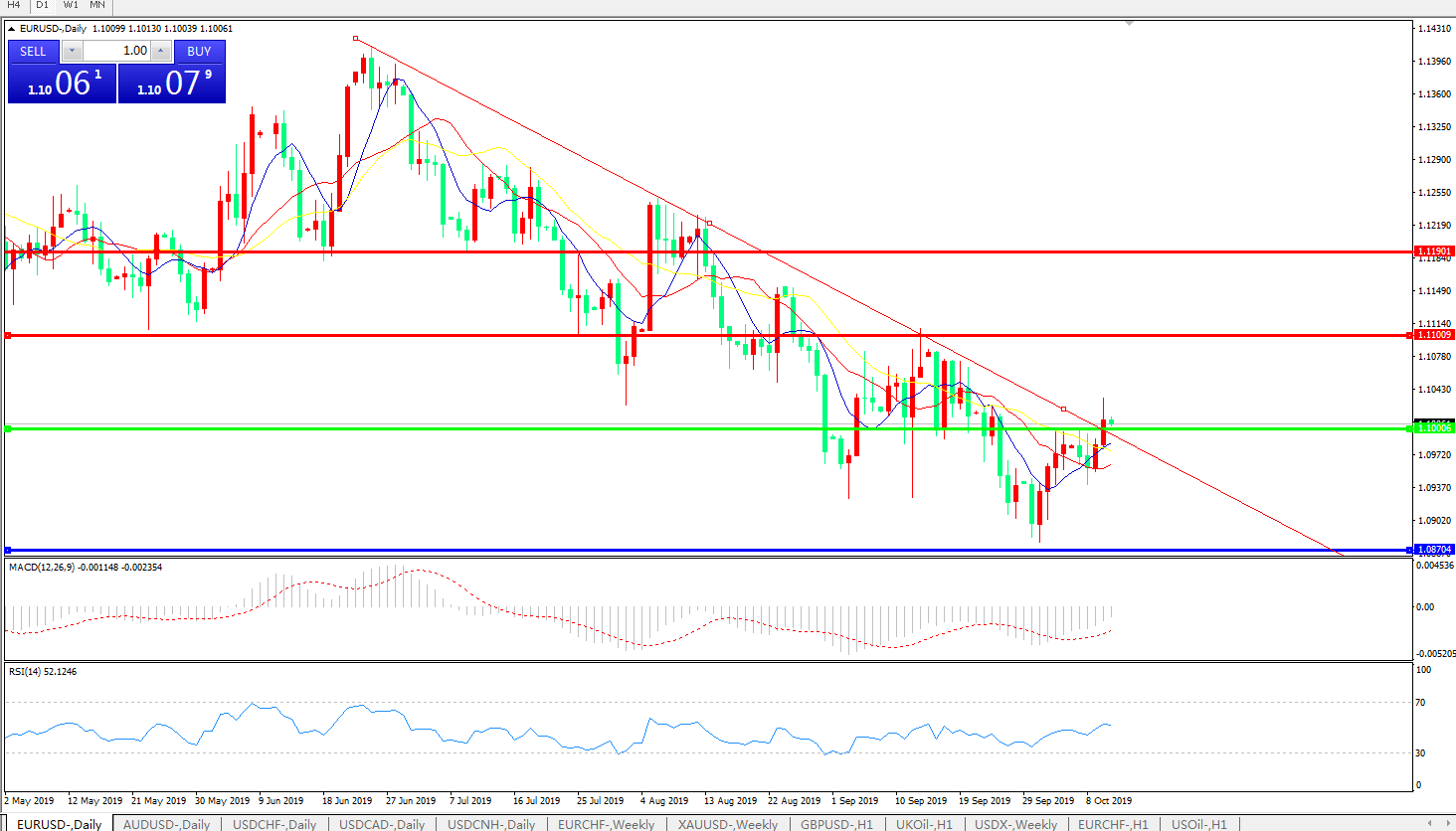 欧元兑美元自周三欧洲时段以来维持坚挺走势,因此前欧洲央行副行长金多斯的鹰派讲话在市场引起共鸣,投资者据此调低了欧洲央行新行长上任之后采取的进一步宽松措施的力度预期。与此同时,美元指数则因为贸易领域消息面的反复而略有承压; 不过,欧元兑美元反弹浪潮仍受阻于1.10关键心理关口,而过去一周以来,欧元汇价好几度触及1.10关口后均无功而返,令这一心理关口的阻力强度进一步倍增。虽然欧洲央行试图为过于激进的宽松前景预期降温,但是只要欧元区经济数据不出现明显好转,投资者就没有必胜的信心去继续做多欧元;市场正关心日内稍后的欧洲央行9月会议纪要给出更多的未来政策指引,同时英国脱欧和国际贸易领域消息的进一步发酵,也会对市场情绪产生微妙的影响
