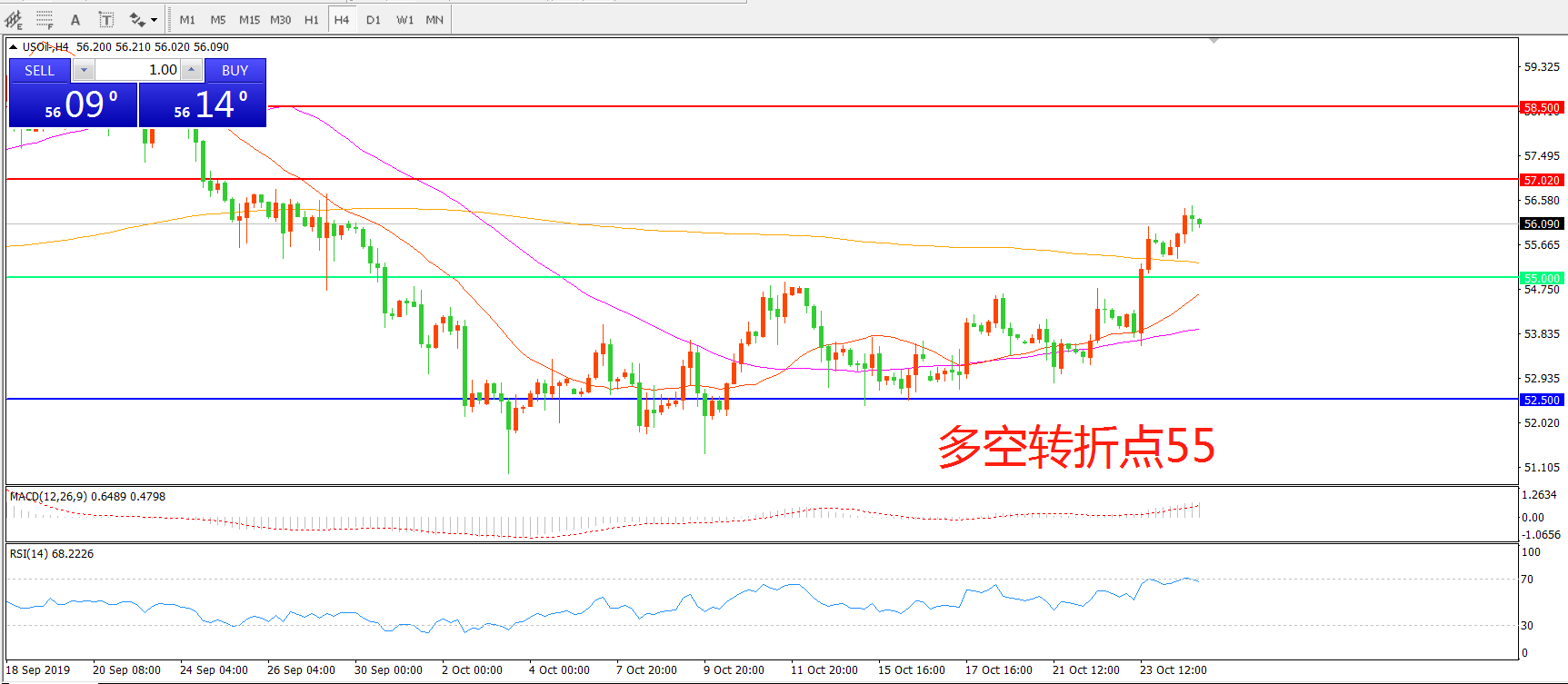 4小时图看,油价强势冲高后小幅回落,整体走势偏强,57美金成为上方阻力,200周期成为下方支撑,短期均线有拐头迹象,MACD红柱增加,日内延续上行概率较大。