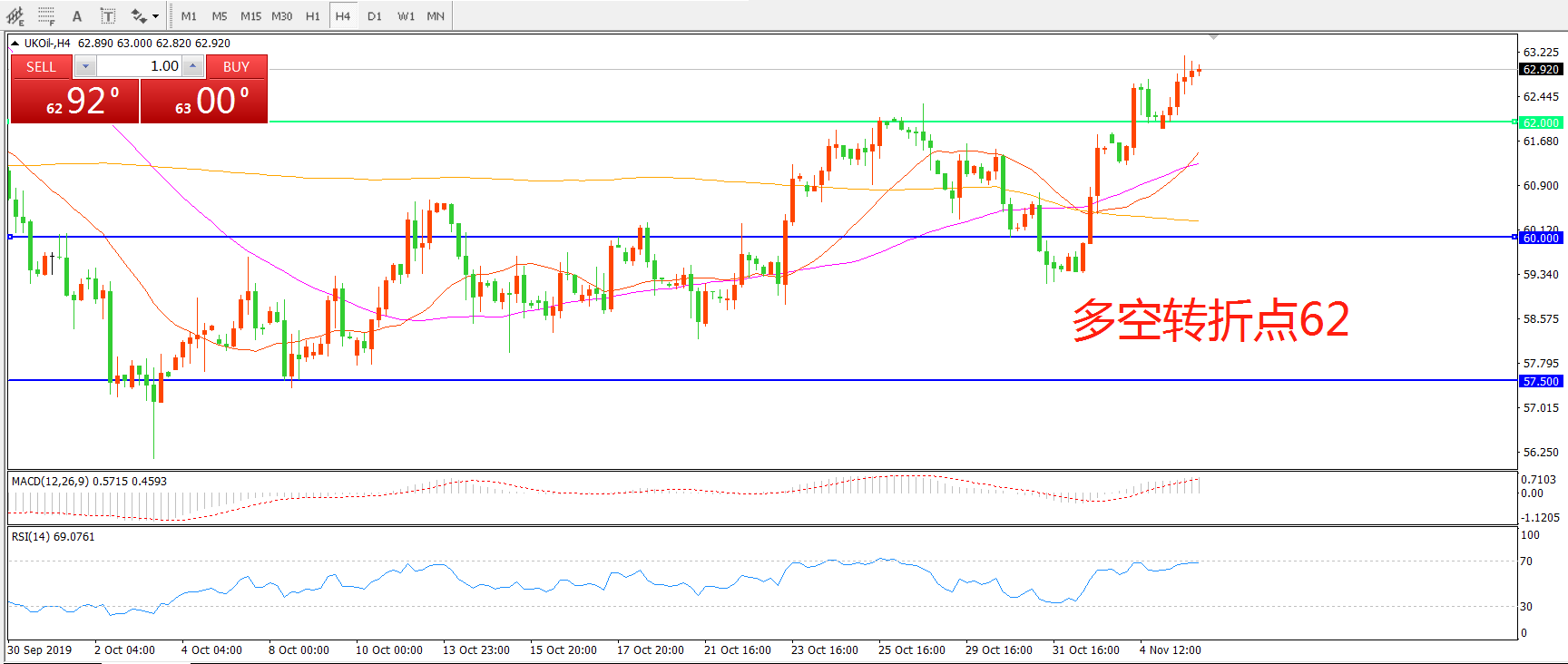 周三(11月6日)凌晨,美国石油协会(API)公布的数据显示,美国截至11月1日当周API原油库存增加426万桶,远超预期的272.1万桶,但汽油和精炼油库存同步减少抵消了一部分数据的利空效应,数据公布后,布油短线快速走低后再度拉起,收报62.95美元/桶。因乐观经济数据及看好中美将签署贸易协议,油价维持强势上行,晚间22:30分将公布EIA原油库存数据,务必重点关注。