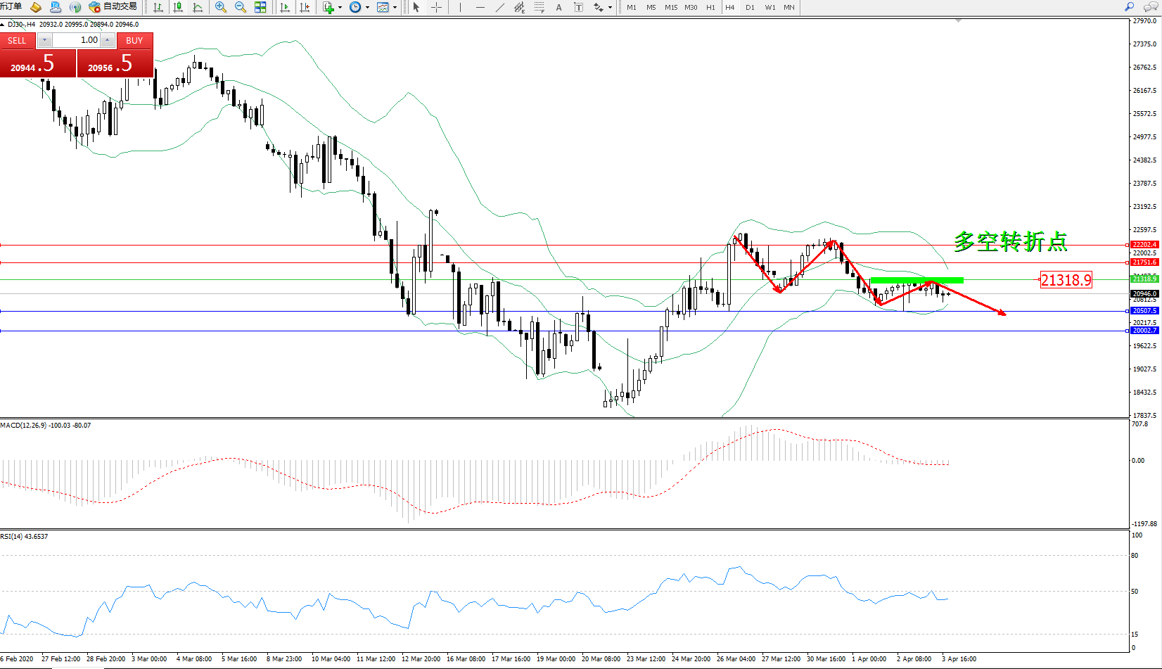 交易策略:21318下方看跌,目标20507、20002