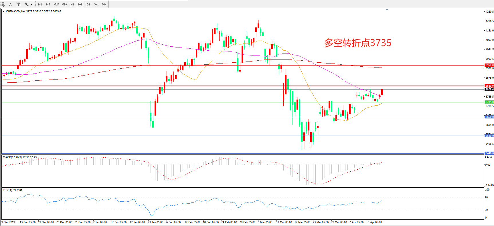4小时图看,沪深300高开高走,光头阳线收盘预示整体走势偏强,短期均线拐头向上,MACD红柱增加,RSI指标向上,日内延续上行概率较大。