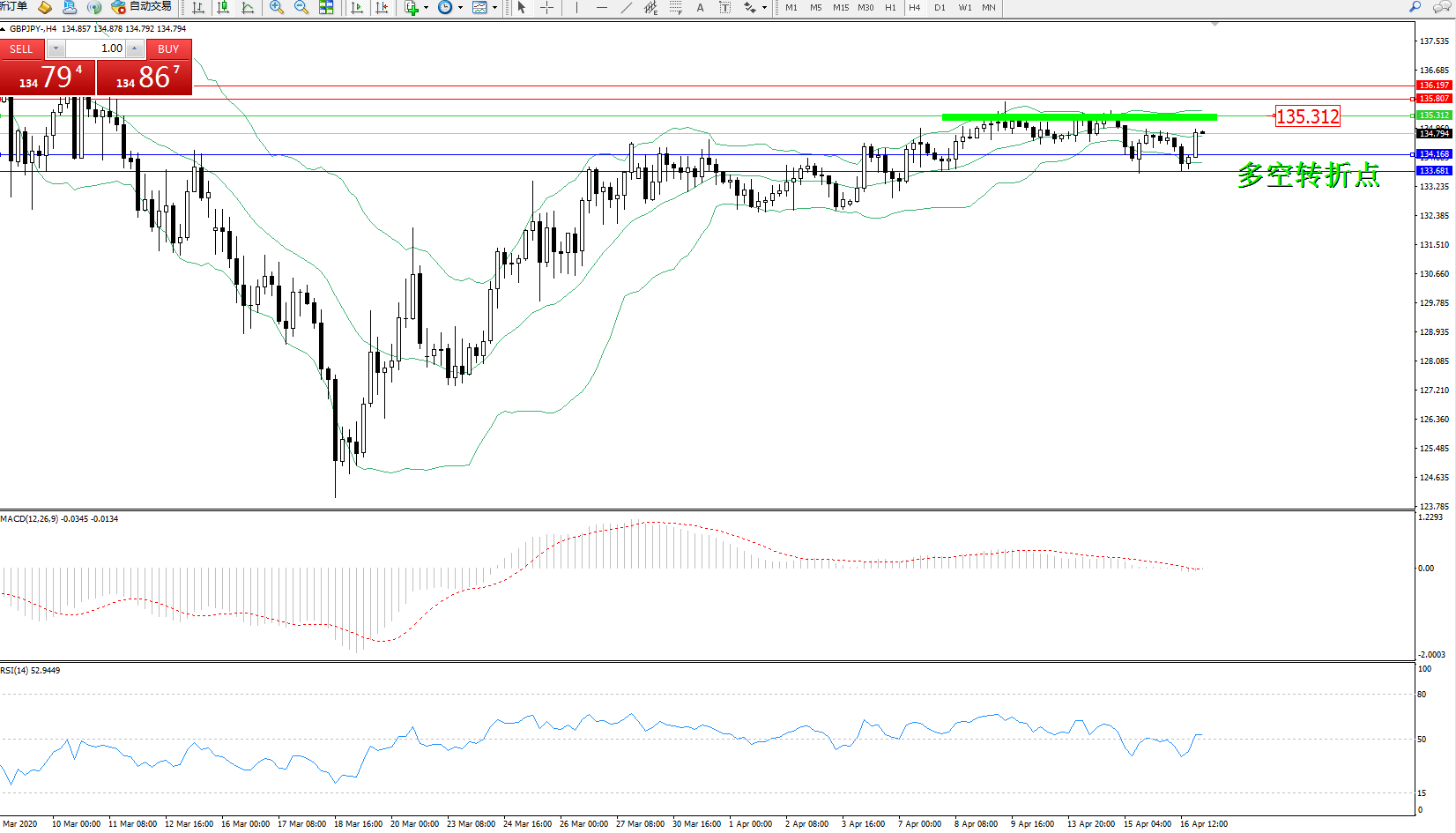 交易策略:135.312下方看跌,目标134.168133.681