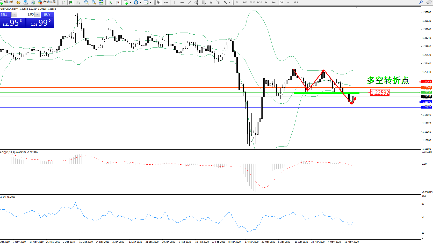 交易策略:1.22592下方看跌,目标1.21080、1.20222
