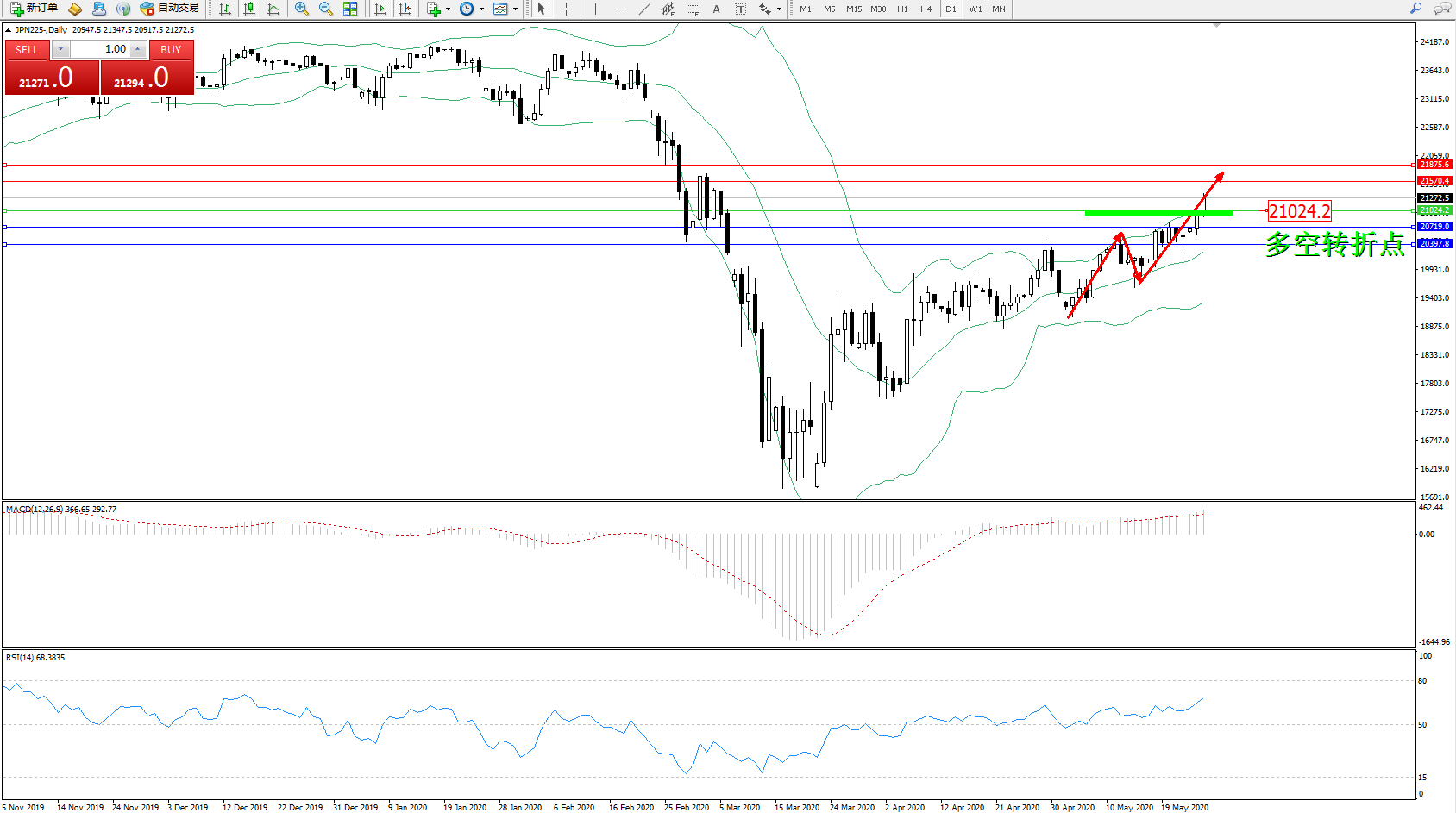 日经225指数5月26日(周二)收盘上涨544.85点,涨幅2.63%,报21286.50点。日本央行行长黑田东彦: 日本央行将积极购买国债,从经济、金融状况来看,日本央行当前的收益率目标水平是合适的,如果我们需要进一步降低收益率曲线,我们将根据需要调整国债购买量,由于市场对日本财政的信心,日本利率稳定,日本央行能够在收益率曲线控制(YCC)之下维持长期利率在低位,因为市场信任日本保持中期利率的决心和维持长期财政健康,即便疫情受控,人们的生活方式也很难回到疫情前,尤其是服务行业发生了重大变化,不认为日本会陷入通货紧缩,同样通胀也不会加速上行太多,预计日本经济在本季度将比一季度遭受更大的收缩,日本经济可能在第二季度萎缩更多,日本央行的预测显示,日本不会陷入通货紧缩,正如持续的价格下跌所定义的那样,但也不会看到通货膨胀加速。