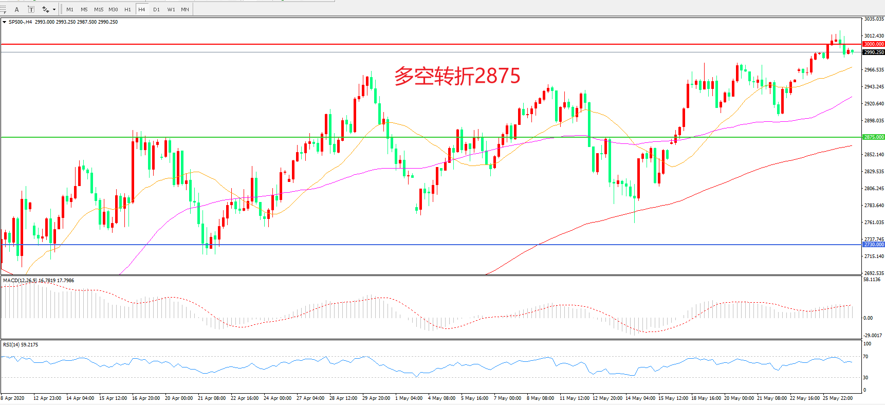 4小时图看,标普500高开低走,整体表现相对强势,3000点成为多空博弈焦点,均线系统呈多头排列,MACD红柱减少,RSI指标走平,日内延续震荡概率较大。
