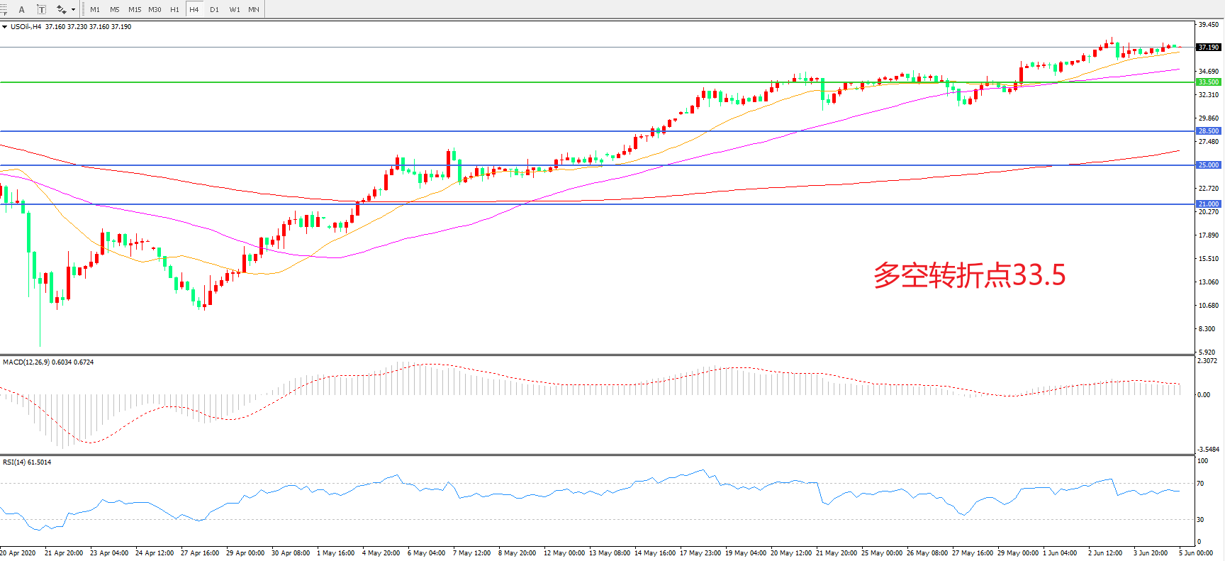 周四(6月4日),OPEC+是否延长减产协议仍然有待确认,油价在震荡交投中持稳,美国WTI原油小幅反弹,收报37.34美元/桶。全球两大石油生产国沙特和俄罗斯已同意支持减产延期至7月,但他们没有同意在周四举行欧佩克+会议以讨论减产问题,他们同时向那些不遵守减产协议的国家施压,要求其进一步削减产量。