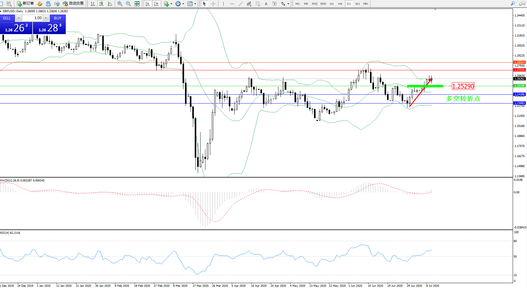 交易策略:1.25290上方看涨,目标1.27333、1.28314