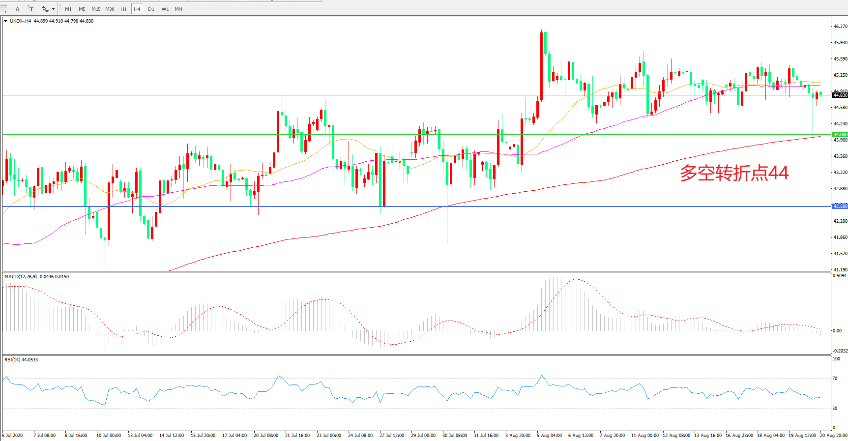 周四(8月20日),OPEC+需要补偿逾200万桶/日的超额原油供应,且美国初请失业救济人数意外上升给油价带来了压力,布油一度大跌逾3%,好在美股低开之后逐渐高走,原油价格也逐渐从低点开始恢复,布伦特原油反弹后收报44.83美元/桶,上演了一场精彩的深V反转行情。