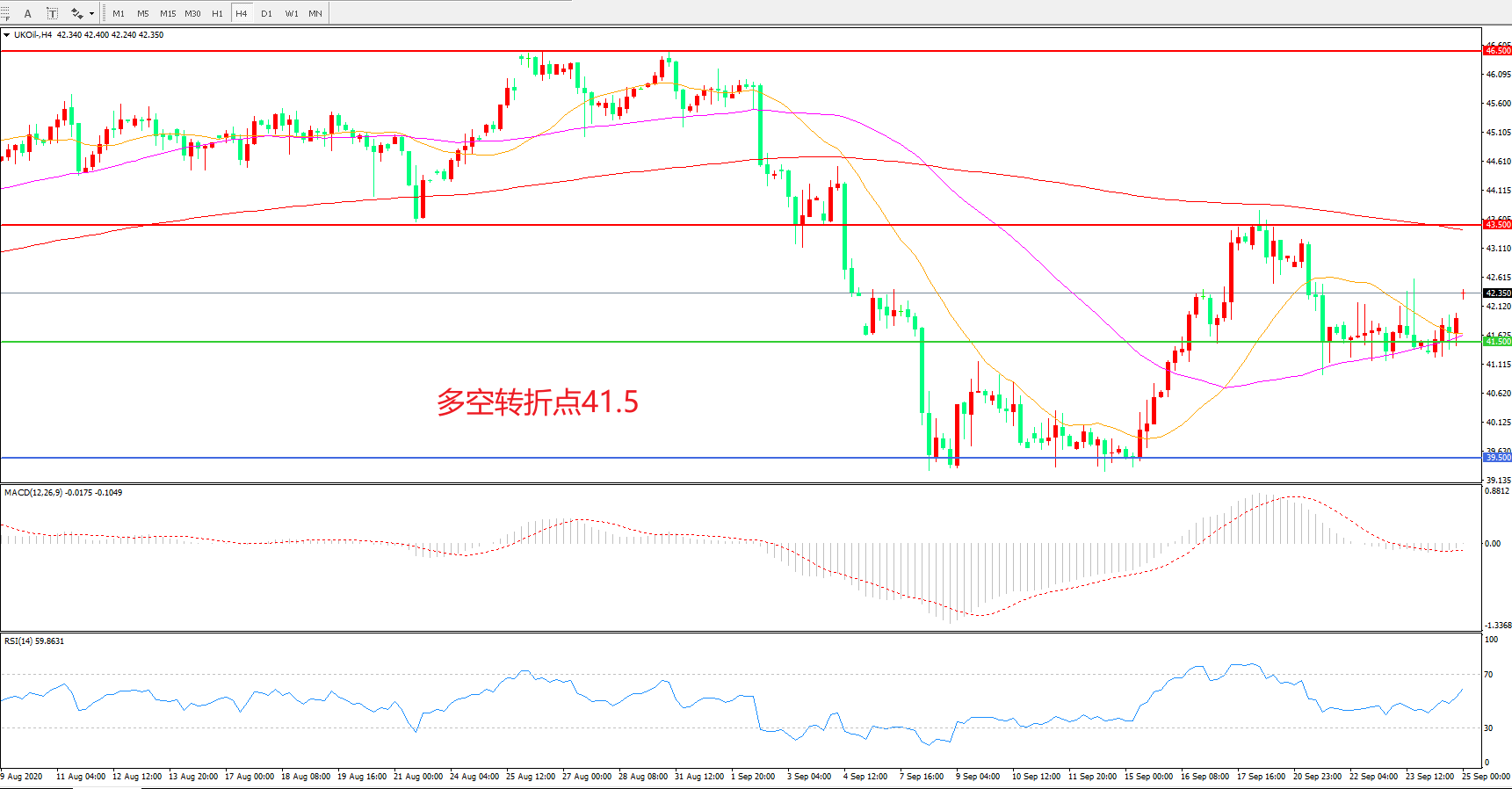 4小时图看,油价以41.5美元为依托震荡反弹,整体表现有所回暖,均线系统走平,MACD绿柱减少,RSI指标向上,日内延续上行概率较大。