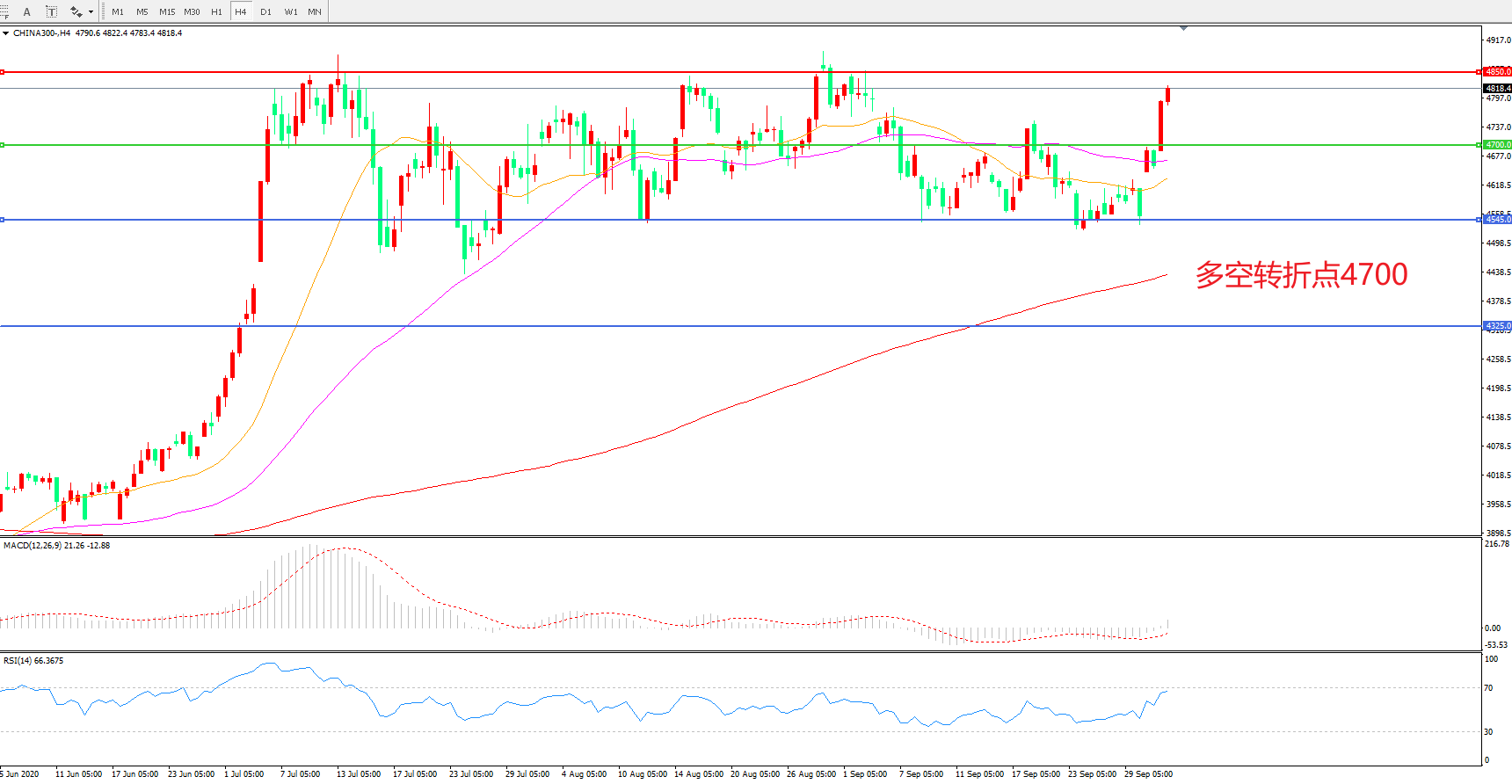 4小时图看,沪深300高开高走,表现强势,4800成为短期多空分水岭,均线系统走平, MACD红柱增加,RSI指标向上,日内延续上行概率较大。