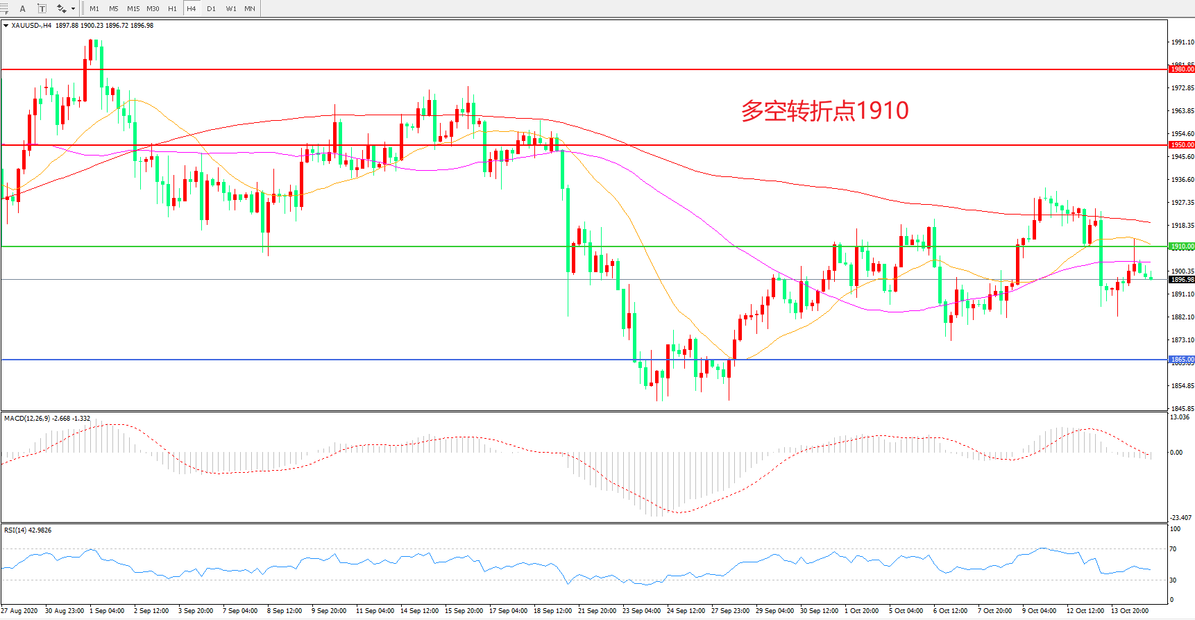 周三(10月14日),金价依然与美元指数呈现明显的负相关行,起初美元指数受到强势英镑打压而走软,现货黄金自低位涨逾30美金,突破1910关口,但随着美元指数大幅回升,现货黄金回落至1900美元关口附近,收报1899.39美元/盎司。