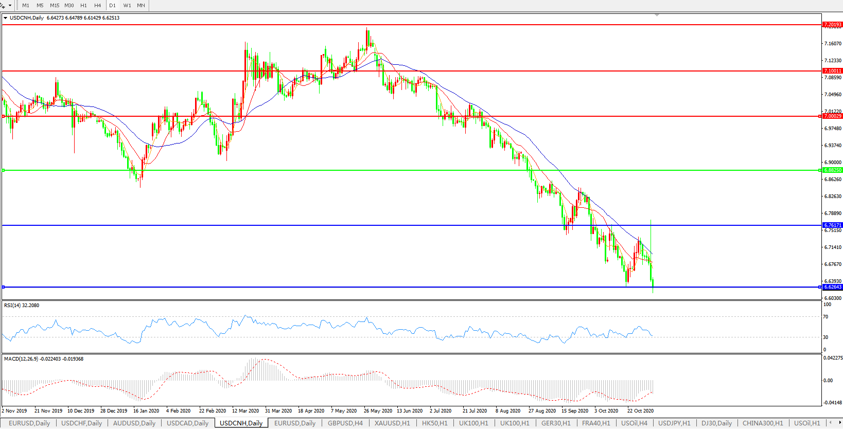 人民币兑美元即期周三收盘缩量收跌逾250点并创一周新低,日内盘中剧烈震荡,中间价则续创逾一周新高;交易员称,美大选选情胶着,在关键州特朗普领先,市场避险情绪急速升温美指重返94关口,人民币扩大跌幅并破6.75元关口,后跌幅收窄;虽然最终结果尚未出炉,但市场已经做好特朗普连任心理准备,预计美指将维持强势; 特朗普赢下关键的佛罗里达、俄亥俄及德克萨斯等州,粉碎了市场对于有个明确结果的期望;投资人等着看到底特朗普能否保住密西根、威斯康辛及宾州等“锈带”州的选票,这些州是他2016年当选的关键;在数以百万计的选票仍未清点的情况下,特朗普总统周三就声称自己已经赢得了美国大选;稍早民主党总统候选人拜登表示有信心赢得胜利;大选情势胶着,最终结果可能要等几个州完成计票才能知道,而这可能需要等上几个小时甚至几天时间。