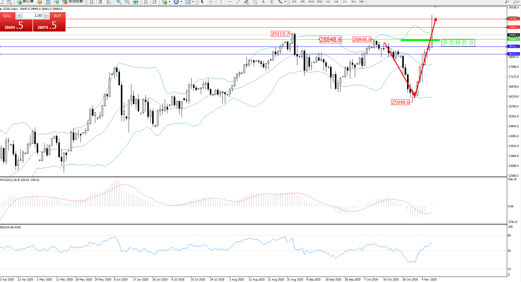 道琼斯指数11月9日(周一)收盘上涨834.60点,涨幅2.95%,报29157.97点。美股三大指数收盘涨跌不一,因亚马逊公和奈飞等科技巨头遭抛售,因有消息称辉瑞和BioNTech共同开发的新冠疫苗防止了超过90%的感染。投资者撤出了避险资产,投入到与经济增长密切相关的市场,MSCI全球指数的市值一度增加1.8万亿美元。美股尾盘收窄涨幅,因参议院多数党领袖麦康奈尔说特朗普总统“百分百有权”调查任何可能的投票违规行为、要求总统竞选重新计票,并且没有义务接受媒体宣称的拜登获胜。此外,美联储警告称,如果新冠疫情带来的经济影响在未来数月出现恶化,主要市场资产价格仍可能遭受打击。有关疫苗的消息给了交易商希望,明年疫情可能会得到控制,这将帮助人们恢复正常生活,提振需求。尽管疫苗将推动石油向着复苏迈出一大步,但因疫情对需求造成了严重损害,部分经济领域可能将永久改变能源消费方式,因此市场仍然谨慎。