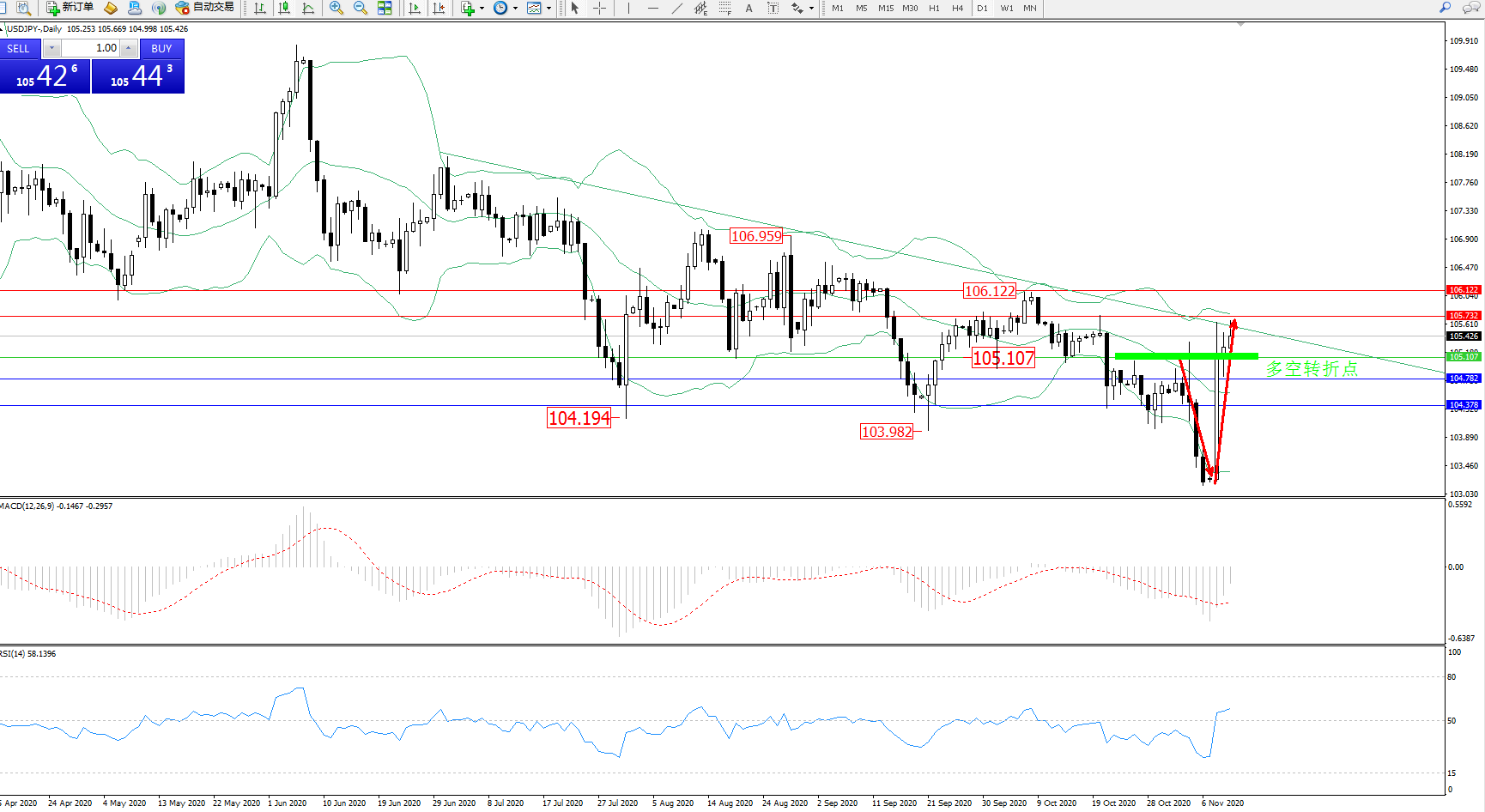 美元兑日圆持续上扬至105.422附近震荡,因市场风险偏好回升,美元指数大幅走高至93关口上方,同时市场依旧对未来几个月内接种疫苗持乐观态度,这令全球风险资产回升,避险日元需求有所下滑。后市恐重新试探105关口支撑,因在疫苗研发获进展带来的消息面狂欢过后,市场情绪开始重归谨慎。投资者目光重新投向美国选情及近期财政政策的僵局上,这将令美元指数重新承压。而近期欧洲与北美地区继续上行中的疫情数据也继续利多避险日元买需;因而在全球负面消息事件仍云集的大背景下,日元汇价仍将向100关口逐步迈进,尤其该考虑到,美联储与欧洲央行下一步的宽松预期,正和日本央行当前已经在政策层面上无计可施的状况构成了鲜明反差,这也将倒逼日元汇价继续被动升值。